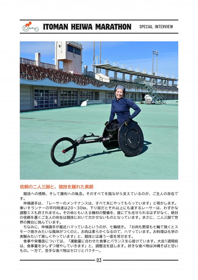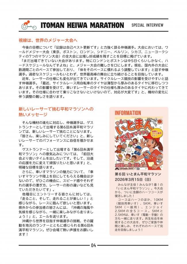 第6回 糸満平和マラソン のゲストランナーとしてご参加いただく 仲嶺 翼 選手に、スペシャルインタビューを実施。 車いすマラソンの魅力や、沖縄から世界を目指すことへの思いなど、熱いメッセージをたっぷり語っていただきました。